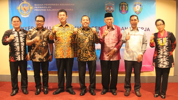 LHP Kinerja atas Efektivitas Upaya Pemerintah Daerah dalam Pemenuhan Kebutuhan Guru dan Tenaga Kependidikan yang Profesional pada Pemerintah Provinsi Kalimantan Utara dan Instansi Terkait Lainnya Tahun Anggaran 2015, 2016, 2017 (Semester I) diserahkan langsung oleh Kepala Perwakilan Tornanda Syaifullah kepada Wakil Ketua II DPRD Provinsi Kalimantan Utara, Marwansyah, dan Wakil Gubernur Kalimantan Utara, Udin Hianggio.