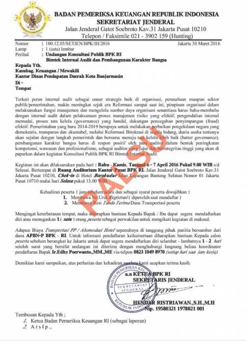 Sehubungan dengan beredarnya undangan Bimbingan Teknis yang mengatasnamakan Badan Pemeriksa Keuangan (BPK), bersama ini kami beritahukan bahwa BPK TIDAK PERNAH mengeluarkan undangan tersebut, tetapi dikeluarkan oleh pihak-pihak yang tidak bertanggungjawab.