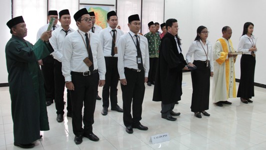 Pengucapan sumpah dipandu oleh Kalan dengan diikuti oleh seluruh pegawai yang diambil sumpahnya. Untuk penandatanganan berita acara pengambilan sumpah/janji PNS secara simbolis dilakukan oleh perwakilan peserta sesuai dengan agamanya. Untuk peserta beragama Islam dilakukan oleh Andika Putra dengan saksi Ridwan Sani Matondang dan Andi Syafruddin; peserta beragama Kristen Protestan diwakili oleh Sondang Malia dengan saksi Ruben Sidabutar dan Nathalya; sedangkan untuk peserta beragama hindu dilakukan oleh A.A.I.Indah Oktarini dengan saksi Pawana Darma W dan Asep Kankan Syaukani.