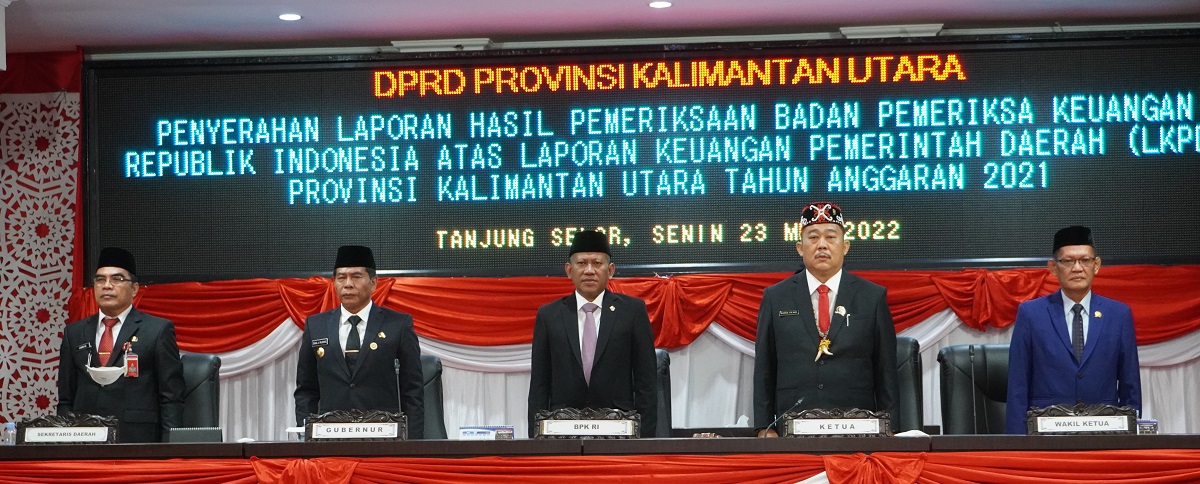 PK menyerahkan Laporan Hasil Pemeriksaan (LHP) atas LKPD Provinsi Kalimantan Utara Tahun Anggaran (TA) 2021 dan Laporan atas Pemeriksaan Kinerja atas Efektivitas Upaya Penanggulangan Kemiskinan. LHP tersebut diserahkan oleh Anggota VI BPK/Pimpinan Pemeriksaan Keuangan Negara VI BPK RI, Dr. Pius Lustrilanang, S.IP., M.Si., CFrA., CSFA. didampingi Kepala Perwakilan BPK Provinsi Kalimantan Utara Arief Fadillah S.E., M.M. kepada Ketua DPRD Albertus Stefanus Marianus, ST dan Gubernur Kalimantan Utara Drs H Zainal A Paliwang SH, M.Hum.