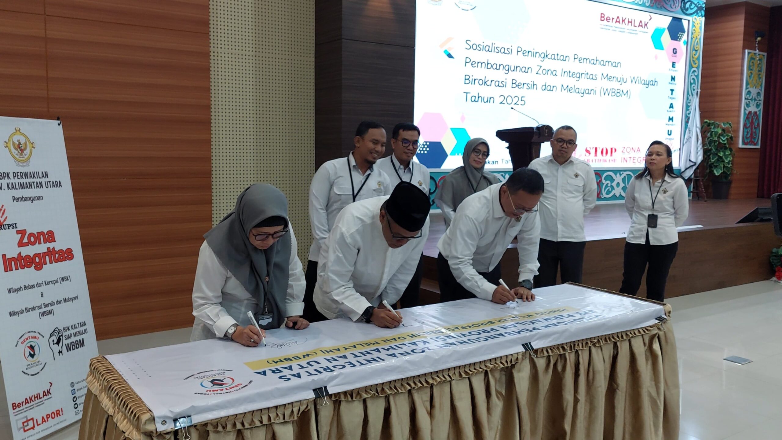 Sementara itu, arahan strategis Bapak Dwi Sabardiana, S.E., M.A., CFrA, CSFA, ERMCP selaku Kepala BPK Perwakilan yang menitikberatkan pada tata kelola transparan, pelaporan akuntabel, dan optimalisasi proses bisnis menjadi pijakan utama dalam mendorong inovasi layanan serta peningkatan kompetensi sumber daya manusia. Dukungan kolektif juga ditunjukkan melalui penandatanganan banner Dukungan BPK Perwakilan Provinsi Kalimantan Utara menuju WBBM oleh seluruh pejabat dan pegawai sebagai simbol internalisasi nilai-nilai anti-korupsi dan penerapan prinsip Good Governance. Rangkaian kegiatan ini bukan hanya menandai keseriusan institusi dalam melakukan pembenahan sistemik, tetapi juga menciptakan momentum transformasi menuju organisasi yang lebih profesional, efektif, dan berintegritas tinggi.