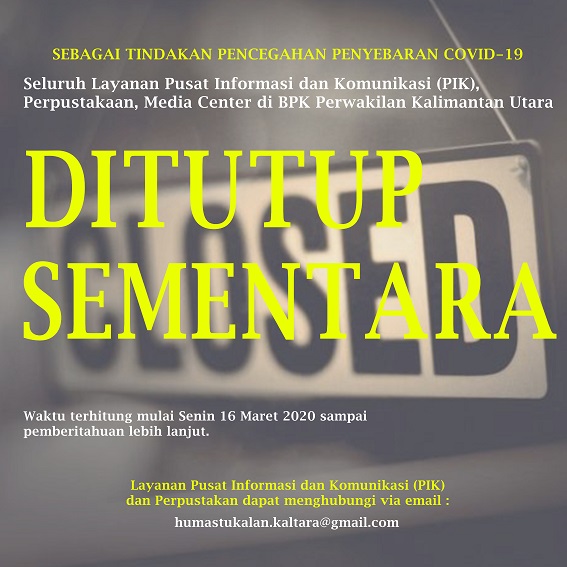 Seluruh Layanan PIK, Perpustakaan, dan Media Center di BPK Kaltara Ditutup Sementara