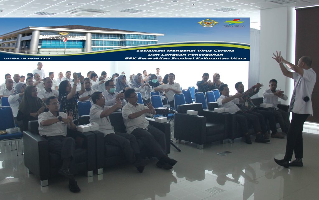 Untuk melakukan pencegahan merebaknya virus Coronavirus Disease (COVID-19) BPK Perwakilan Provinsi Kalimantan Utara bekerjasama dengan Rumah Sakit Pertamedika Tarakan menyelenggarakan Sosialisasi dan langkah pencegahan virus corona pada 04 Maret 2020. Hadir pada kegiatan tersebut pejabat struktural, pejabat fungsional, dan para pegawai di lingkungan BPK Perwailan Provinsi Kalimantan Utara.