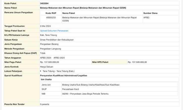 Dalam situs http://lpse.tanatidungkab.go.id/eproc4/nontender, alokasi tersebut terpampang untuk kegiatan belanja makan minum rapat O2SN. Jenis pengadaan langsung dari APBD Pemkab Tana Tidung 2024 ini menelan anggaran total 137,5 juta.